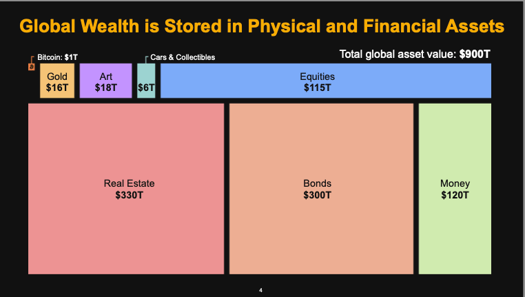 On the other hand, utility assets are those we use in our daily lives, like the car we drive, the house we live in, or the businesses we operate. Michael proposes that the $900 trillion of global wealth can be evenly split: $450 trillion as a store of value and $450 trillion in utility.
