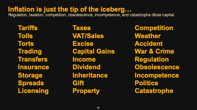 Government coercion isn’t limited to inflation; there are numerous other factors that can erode the value of capital. These include tariffs, natural disasters, war and crime, various forms of taxation, licensing requirements, insurance mandates, and more. The chart below shows the elements that can contribute to the devaluation of assets in different ways.