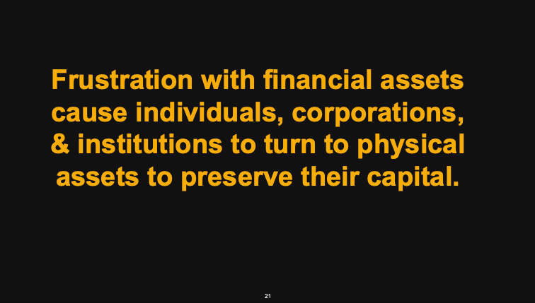 People turn to scarce physical assets to preserve their capital because governments can’t simply print more of them, and in democratic, capitalist countries, they can’t impose price controls on these assets. While taxes can be increased, the government can’t regulate the price of collectible items. This is why the ultra-wealthy often invest in collectible art, gold, beachfront properties, or other scarce physical assets like vintage cars and rare paintings.