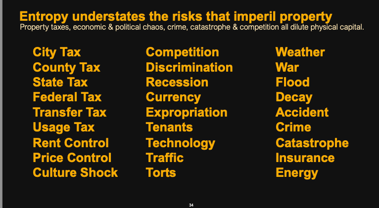 Consider the common example of a rental property purchased as a store of value. While it may seem like a solid investment, owners often overlook the numerous challenges beyond just maintaining the property. They must also pay property taxes, secure home insurance, manage rent control regulations, navigate city politics, deal with tenant behavior, and address issues like water leaks from floods or weather damage. These factors, often underestimated, can significantly erode the value of physical capital over time.