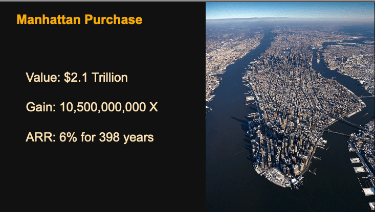 Manhattan, purchased by the Dutch has since transformed into one of the most valuable pieces of real estate in the world, now valued at approximately $2.1 trillion. This represents an astronomical gain of 10.5 billion times the original investment over 398 years. Calculating this impressive return reveals an average annual growth rate (APR) of around 6%. This incredible appreciation underscores the power of strategic long-term investment and foresight, where a modest initial outlay, coupled with an understanding of future potential, can lead to unimaginable wealth over centuries. Manhattan’s evolution from a sparsely populated island to a global financial hub illustrates the profound impact of compound growth over time.