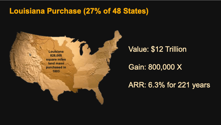 The Louisiana Purchase has seen its value skyrocket to an estimated $12 trillion today. This represents a staggering gain of 800,000 times the original investment over 221 years. The average annual growth rate (APR) for this land has been approximately 6.3%. This remarkable appreciation highlights the foresight of the purchase, which not only expanded the U.S. territory but also secured resources and strategic advantages that have compounded in value over time, making it one of the most significant real estate deals in history.