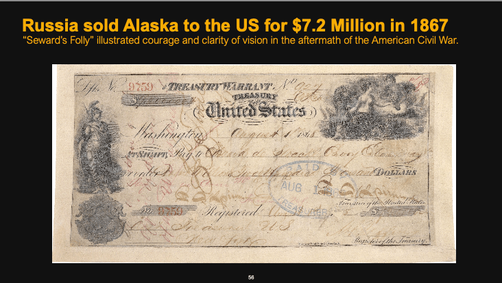 In 1867, Russia sold Alaska to the United States for $7.2 million, a transaction initially ridiculed as “Seward’s Folly” after Secretary of State William Seward, who orchestrated the deal. At the time, many Americans saw the purchase as a wasteful expenditure, especially in the aftermath of the Civil War when the nation was focused on reconstruction. However, this deal later proved to be a masterstroke of vision and courage, as Alaska’s vast natural resources, including gold, oil, and timber, contributed immensely to the wealth and strategic strength of the United States. Seward’s ability to look beyond immediate concerns and recognize the long-term value of Alaska exemplifies the importance of foresight in leadership and national growth.