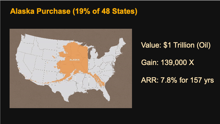 The Alaska Purchase, which added land equivalent to 19% of the contiguous 48 states, is now valued at $1 trillion. This represents an astonishing 139,000-fold increase over the original $7.2 million investment, achieving an average annual growth rate (APR) of 7.8% over 157 years. This dramatic appreciation underscores the far-reaching impact and strategic value of this once-criticized acquisition, which has proven to be one of the most lucrative investments in U.S. history.