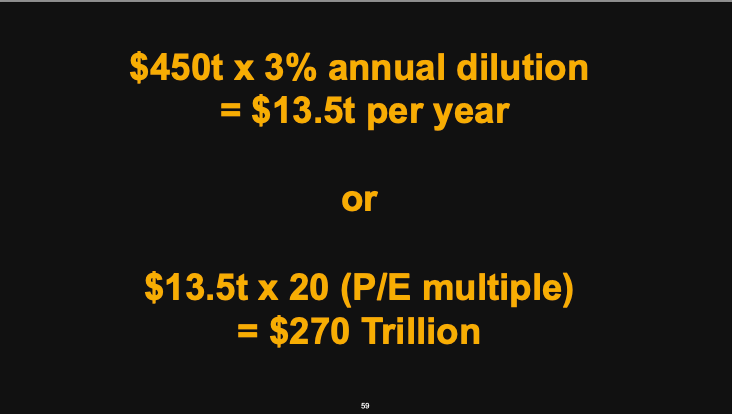 Michael Saylor projects that 3% of financial assets are being diluted annually, resulting in a yearly transfer of $13.5 trillion into alternative assets like Bitcoin. Over the next twenty years, this could lead to a total market value of Bitcoin reaching approximately $270 trillion by 2045.