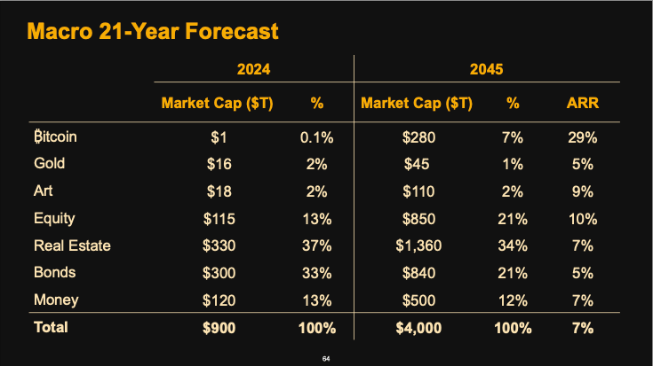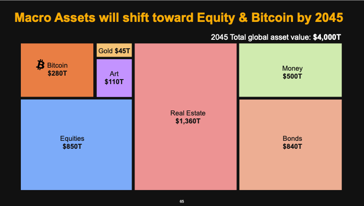 By 2045, the total global assets are projected to reach $4,000 trillion, with Bitcoin anticipated to account for $280 trillion of that value.