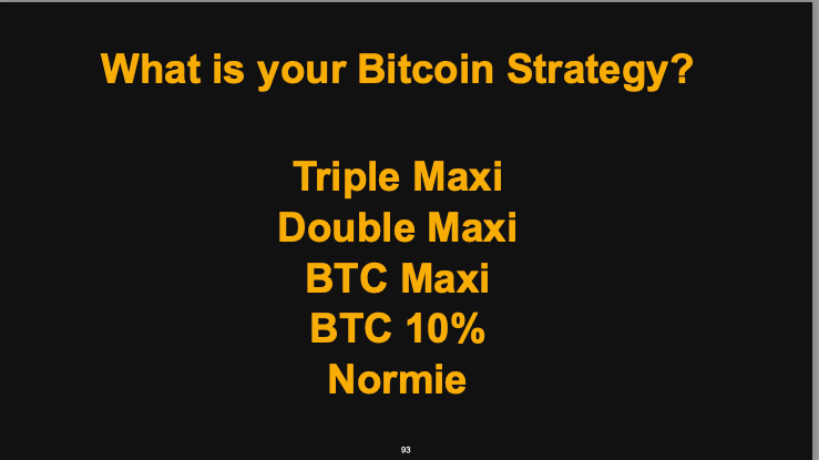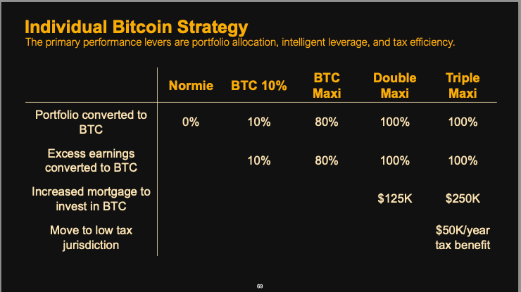 - Triple Maxi: Converts 100% of their portfolio into Bitcoin, puts all excess savings into Bitcoin, takes on maximum debt to invest in Bitcoin, and relocates to a low-tax jurisdiction to save money, further converting those savings into Bitcoin.