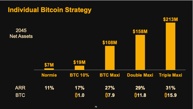 - Double Maxi: Puts 100% of their portfolio into Bitcoin, invests all excess savings in Bitcoin, and also increases their mortgage to invest in Bitcoin.