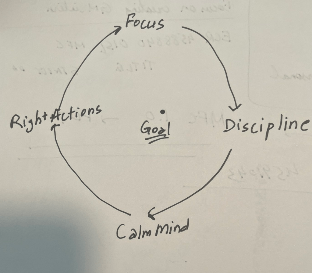 Focus leads to discipline, discipline creates a calm mind, and a calm mind produces right actions. If you’re not calm, your energy dissipates, and you lose focus.